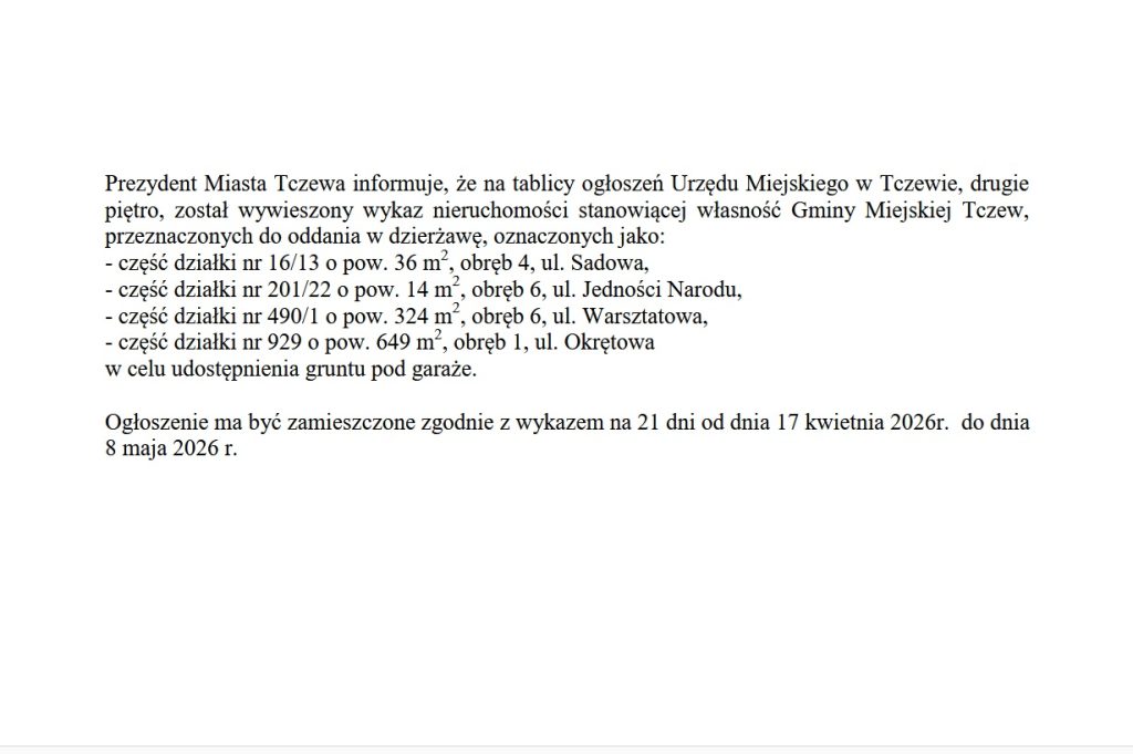 Prezydent Miasta Tczewa informuje o wywieszeniu wykazu nieruchomości przeznaczonych do oddania w dzierżawę