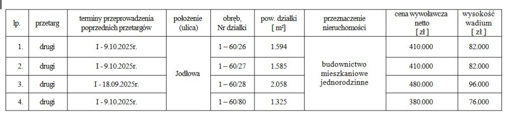 Przetargi odbędą się 22 stycznia 2026r. o godz. 1200 w siedzibie Urzędu Miasta Gorzowa Wlkp. przy ul. Sikorskiego 4 i prowadzone będą wg kolejności podanej w tabeli.