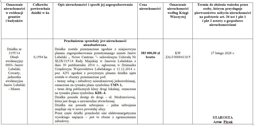 Starosta Janowski podaje do publicznej wiadomości wykaz nieruchomości niżej opisanej będącej własnością Skarbu Państwa położonej na terenie Gminy Janów Lubelski przeznaczonej za zgodą Wojewody Lubelskiego do zbycia