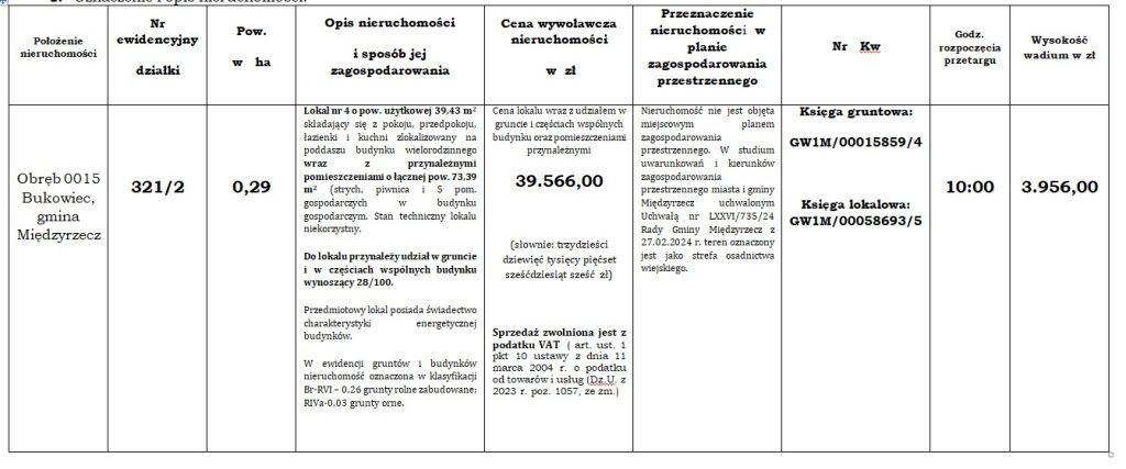 na sprzedaż nieruchomości – lokalu mieszkalnego nr 4 o pow. 39,43 m2 wraz z pomieszczeniami przynależnymi o łącznej pow. 79,39 m2 oraz z udziałem wynoszącym 28/100 w prawie własności nieruchomości oznaczonej nr 321/2 o pow. 0,2900 ha, położonej w Bukowcu 57, gm. Międzyrzecz, stanowiącej własność Skarbu Państwa który odbędzie się w dniu20.04.2026 r. o godz. 10:00 w siedzibie Starostwa Powiatowego w Międzyrzeczu, ul. Przemysłowa 2, pokój nr 411.