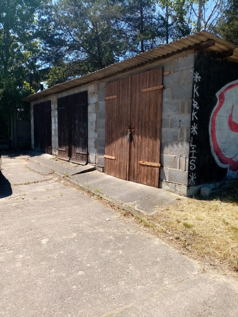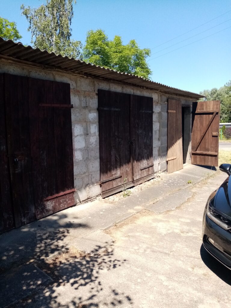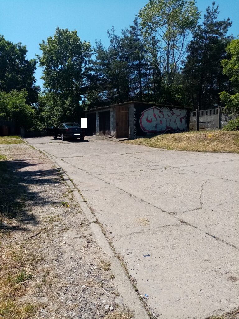 Powyższa nieruchomość jest zabudowana budynkiem garażowym, w części ogrodzona, utwardzona płytami betonowymi oraz porośnięta roślinnością trawiastą. Kształt działki regularny, zbliżony do prostokąta, teren z niewielkim spadkiem w kierunku drogi. Budynek garażowy, parterowy, o powierzchni użytkowej 47,43 m2, składa się z trzech osobnych pomieszczeń do parkowania. Wybudowany został w technologii tradycyjnej murowanej w latach 80-tych XX w.