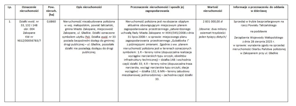 Starosta Tatrzański podaje do publicznej wiadomości wykaz nieruchomości Skarbu Państwa przeznaczonych do zbycia w trybie bezprzetargowym