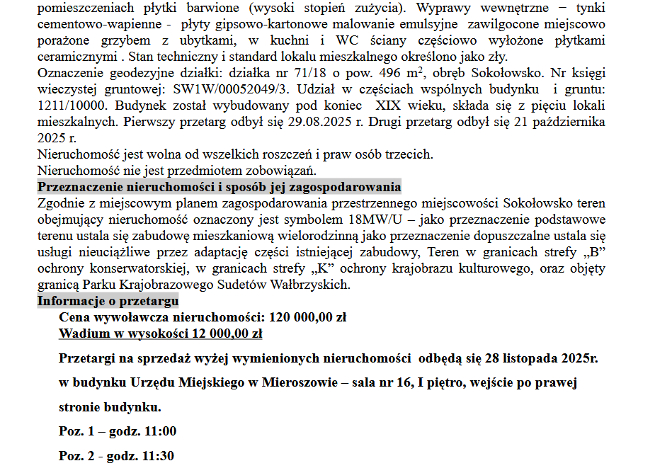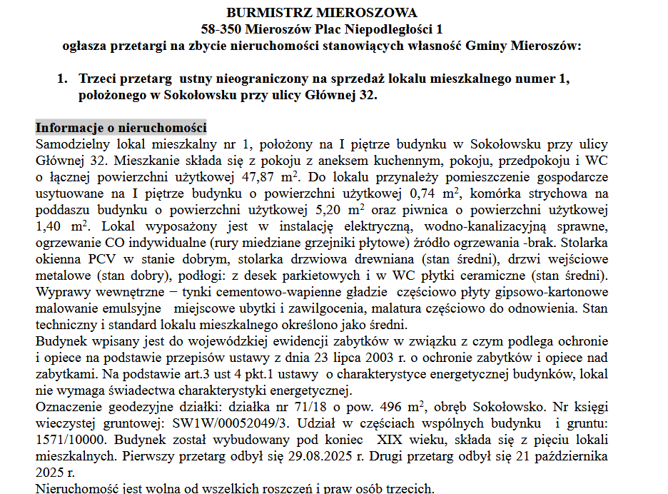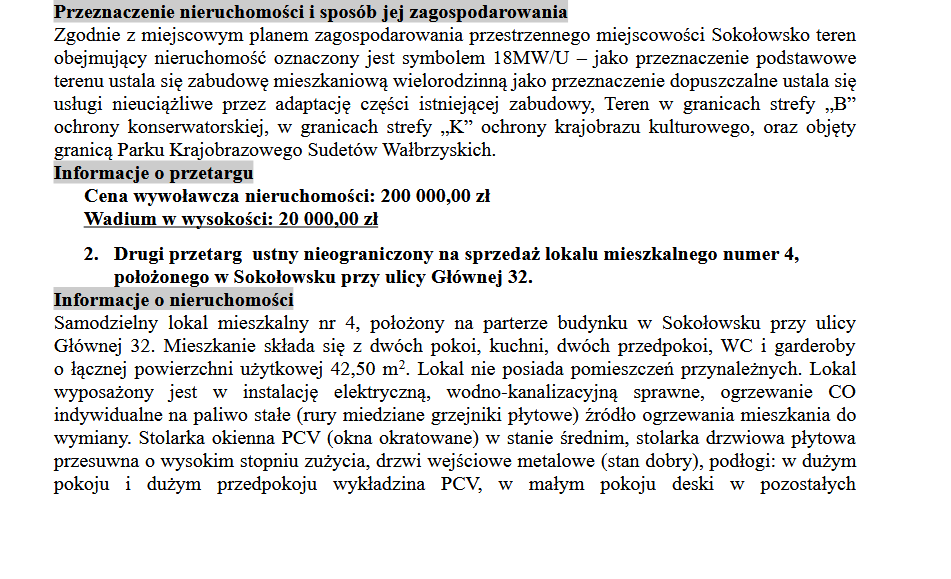Trzeci przetarg ustny nieograniczony na sprzedaż lokalu mieszkalnego numer 1,położonego w Sokołowsku przy ulicy Głównej 32