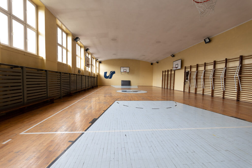 Dach konstrukcji drewnianej pokryty papą w części nad salą gimnastyczną wyremontowany w 2020 roku. Fundamenty i ściany fundamentowe wykonane z kamienia i cegły pełnej, ściany i ściany działowe wykonane z cegły pełnej, schody w części betonowe pokryte lastrico, posadzki cementowe, terrakota, parkiet, panele podłogowe w sanitariatach i płytki ceramiczne. Stolarka okienna – drewniana i PCV, elewacje zewnętrzne otynkowane, obróbki blacharskie z blachy ocynkowanej. Budynek jest wyposażony w instalacje co, wod-kan, energie elektryczną, wentylację w części budynku mechaniczną.