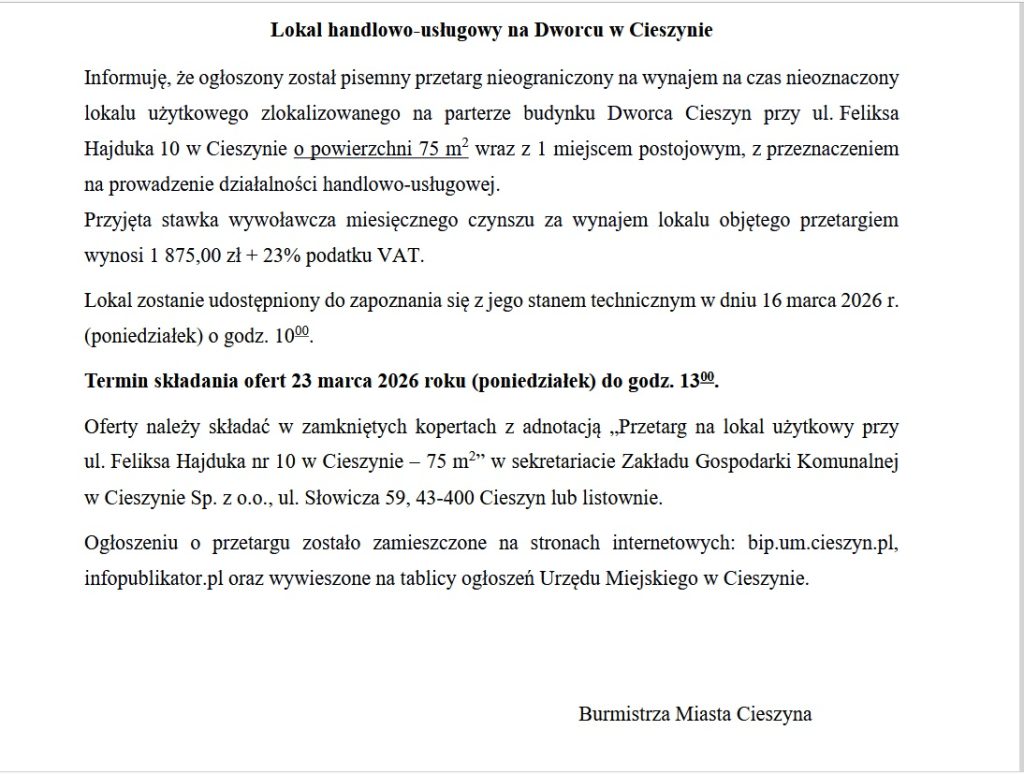 Urząd Miejski w Cieszynie informuje o przetargu nieograniczonym na wynajem na czas nieoznaczonym lokalu użytkowego