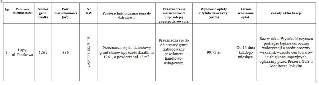Na podstawie art. 35 ust. 1 i 2 ustawy z dnia 21 sierpnia 1997 r. o gospodarce nieruchomościami (t.j. Dz. U. z 2024 r. poz. 1145 z późn. zm.), podaję do publicznej wiadomości, że część działki nr 1261, położonej w Łapach, przy ul. Piaskowej, zostaje przeznaczona do dzierżawy na czas nieoznaczony.