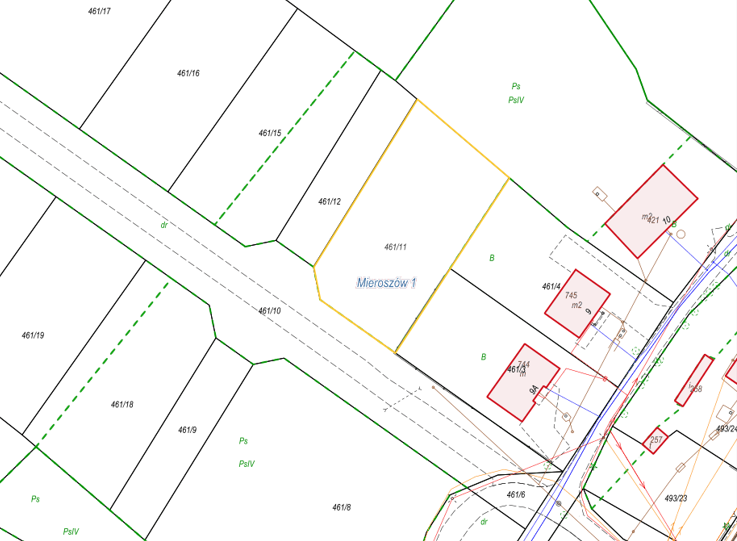 Nieruchomość gruntowa niezabudowana o powierzchni 0,1188 ha, położona w obrębie Mieroszów 1. Działka nr 461/11 jest niezabudowana i stanowi grunt porolny pozostawiony przez kilka lat bez ingerencji człowieka. Nieruchomość zarosła ekspansywnymi gatunkami traw i chwastów. Działka gruntowa o kształcie prostokąta z zachowaną proporcją długości boków, teren o lekkim spadku w kierunku ulicy Wysokiej, z większym zagłębieniem w środkowej części działki i przy granicy z działką numer 461/3. We wspomnianym zagłębieniu terenu po obfitych opadach deszczu i w czasie wiosennych roztopów spływa woda i obszar ten staje się bardzo podmokły. Nieruchomość położona w sąsiedztwie terenów uzbrojonych (bez sieci gazowej), aktualnie działka nie jest uzbrojona. Dojazd i dostęp do nieruchomości poprzez jeszcze nieurządzoną działkę drogową nr 461/10, bezpośrednio z wąskiej ulicy Wysokiej.