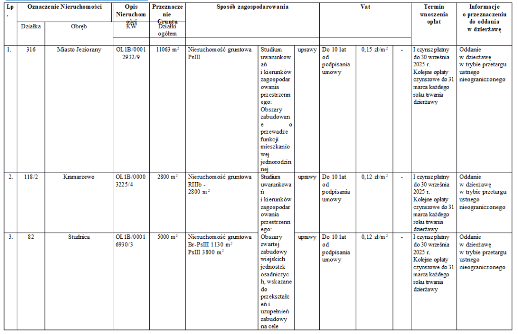 nieruchomości położonych w obrębie Miasto Jeziorany, Kramarzewo i Studnica przeznaczonych do wydzierżawienia na podstawie Zarządzenia Nr 51/2025 Burmistrza Jezioran z dnia 6 maja 2025 roku: