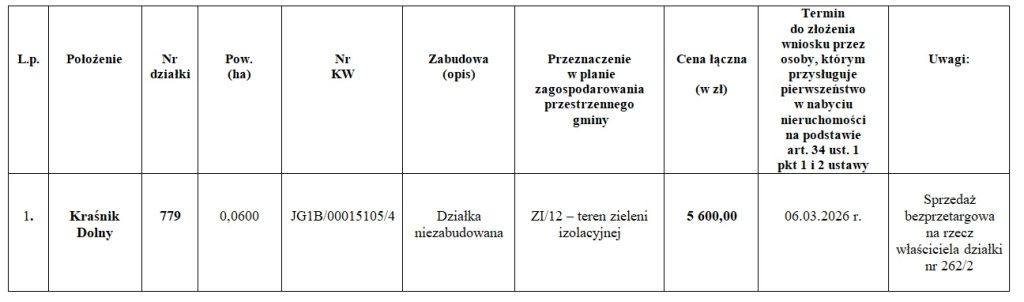 Wójt Gminy Bolesławiec podaje się do publicznej wiadomości wykaz nieruchomości przeznaczonej do sprzedaży