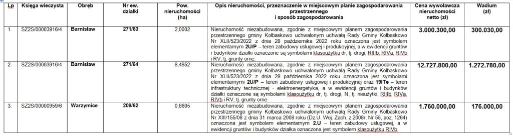 - Nieruchomości opisane w pkt. 1 i 2 położone są w kompleksie działek usytuowanych w obrębie geodezyjnym Barnisław, wzdłuż autostrady A6 w kierunku zachodnim do granicy z Niemcami (brak dostępu do działek z autostrady), na terenie objętym obowiązującym miejscowym planem zagospodarowania przestrzennego zatwierdzonym uchwałą Rady Gminy Kołbaskowo Nr XLII/523/2022 z dnia 28 października 2022 roku (Dz. Urz. Woj. Zachodniopomorskiego z 2022r. poz. 4942), oznaczonym symbolem elementarnym 2 U/P, dla którego ustala się realizację zabudowy i zagospodarowania terenu dla działalności gospodarczych w zakresie: usług, produkcji, składów, baz transportowych i przeładunkowych oraz magazynów wraz z niezbędną zabudową administracyjno-socjalną oraz 19ITe – teren infrastruktury technicznej – elektroenergetyka (dotyczy działki nr 271/64). Nieruchomości położone są w granicach Głównego Zbiornika Wód Podziemnych nr 122 – Dolina Kopalna Szczecin, a nieruchomość stanowiąca działkę nr 271/64, obręb Barnisław znajduje się w strefie ograniczonej ochrony konserwatorskiej stanowisk archeologicznych. Przy realizacji inwestycji obowiązują wszystkie ustalenia ogólne i szczegółowe oraz wskazania załącznika graficznego w/w planu. Działki mają nieregularne kształty, teren działek jest zróżnicowany wysokościowo, pofałdowany i nieogrodzony. Działki objęte są umową dzierżawy – z przeznaczeniem na prowadzenie działalności rolniczej – zawartą w dniu 07.04.2025r., znak: GN.6845.13.2020.MT na okres 1 roku, tj. do dnia 06.04.2026r. pomiędzy Gminą Kołbaskowo, a osobą fizyczną, z której wynika między innymi, że dzierżawca, w razie sprzedaży przedmiotowych nieruchomości, będzie zobowiązany opuścić przedmiot dzierżawy w trybie natychmiastowym i nie będzie wnosił żadnych roszczeń o odszkodowanie z tytułu poniesionych nakładów i braku możliwości zebrania plonów, na co dzierżawca wyraził zgodę. Dojazd do nieruchomości będzie odbywał się po działkach oznaczonych w planie zagospodarowania przestrzennego jako tereny dróg publicznych w klasie dróg lokalnych i dojazdowych. Na terenie części działek drogowych (część terenu oznaczonego symbolem elementarnym 01 KD.L) Gmina zrealizowała inwestycję polegającą na „Budowie nowej drogi gminnej do terenów inwestycyjnych usługowo – produkcyjnych w gminie Kołbaskowo wraz z budową sieci wodociągowej i kanalizacji sanitarnej”, której zakres obejmował budowę drogi głównej o długości całkowitej 1.253,92 km, szerokości 7m z poszerzeniami na łukach poziomych o nawierzchni bitumicznej, z odwodnieniem do dwustronnych rowów drogowych, a także m.in. budowę zjazdu z drogi powiatowej, budowę kanalizacji deszczowej, budowę i przebudowę rowów melioracyjnych, przebudowę infrastruktury teletechnicznej i budowę kanalizacji technologicznej. Ponadto Gmina uzyskała stosowne pozwolenia na realizację kolejnego etapu inwestycji polegającej na budowie dróg gminnych oraz sieci wodociągowej i kanalizacji sanitarnej.