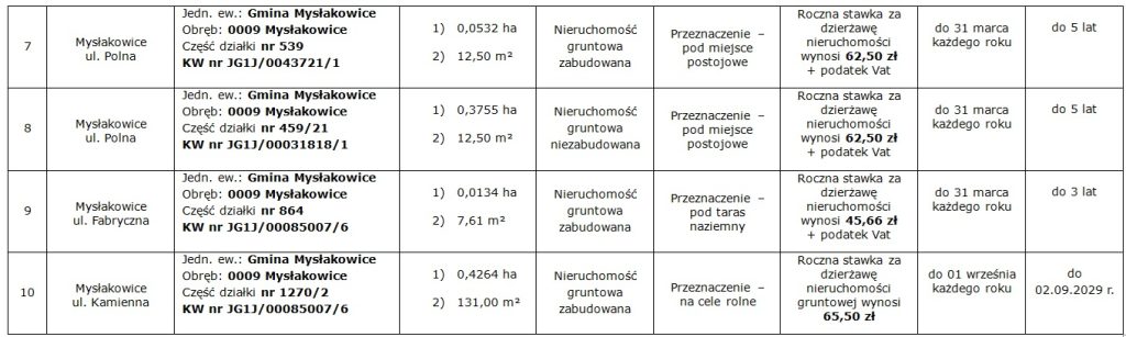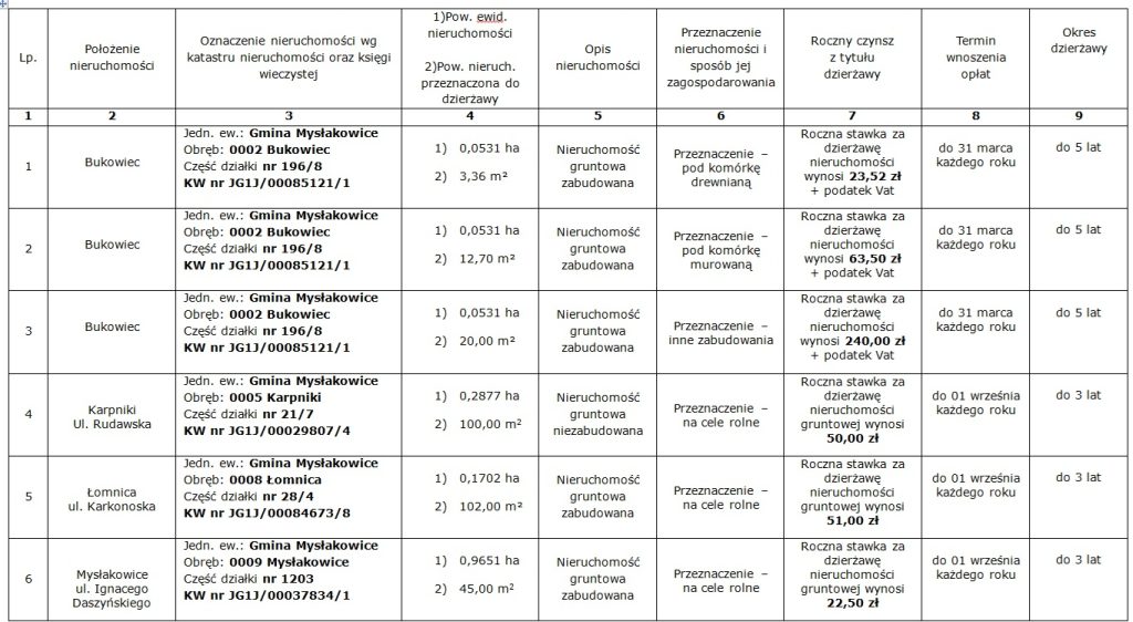 Wójt Gminy Mysłakowice podaje do publicznej wiadomości wykaz nieruchomości przeznaczonych do dzierżawy: