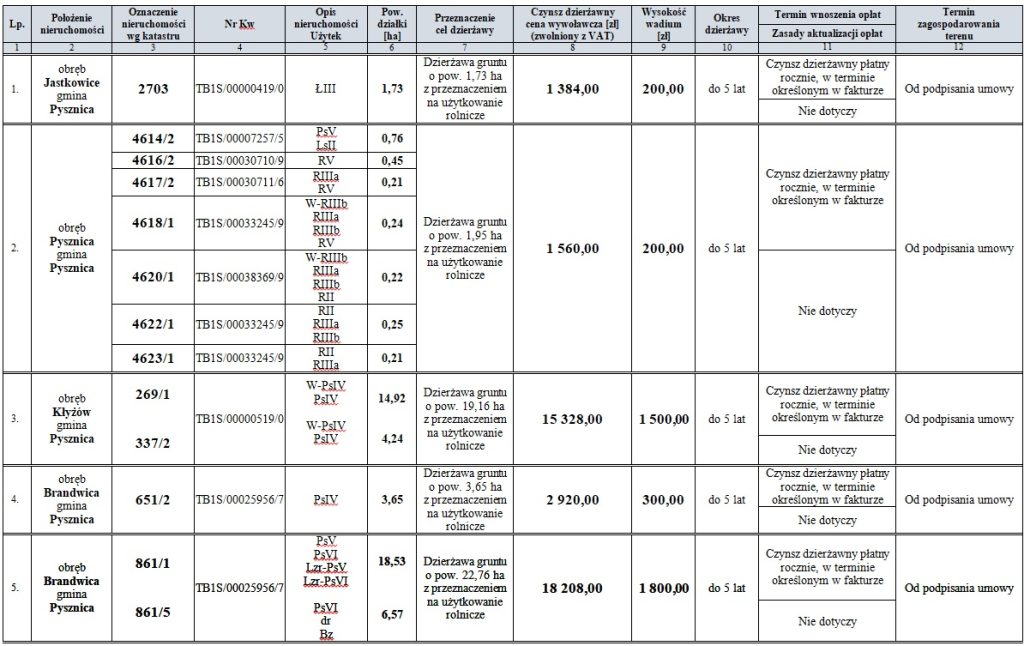 Warunkiem uczestnictwa w przetargu jest wpłacenie wadium w terminie do 28.04.2026 r. na konto Urzędu Gminy w Pysznicy nr 36 9434 1025 2006 1695 1311 0002 BS Tarnobrzeg o/Nisko w wysokości wymienionej w tabeli, z adnotacją w tytule przelewu: „wpłata wadium na dzierżawę działki nr. ……”