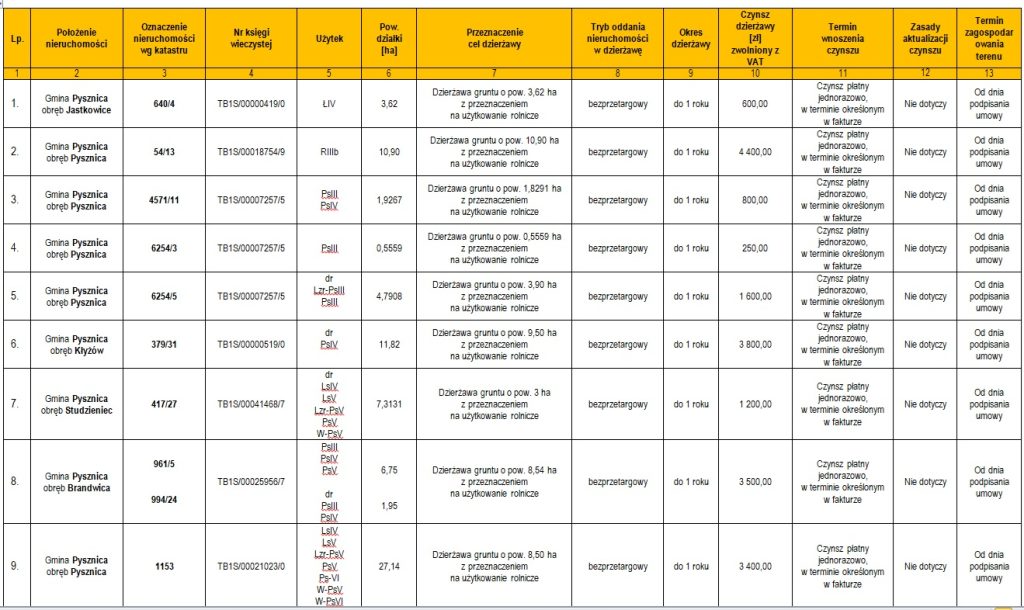 Wójt Gminy Pysznica podaje do publicznej wiadomości wykaz nieruchomości przeznaczonych do dzierżawy