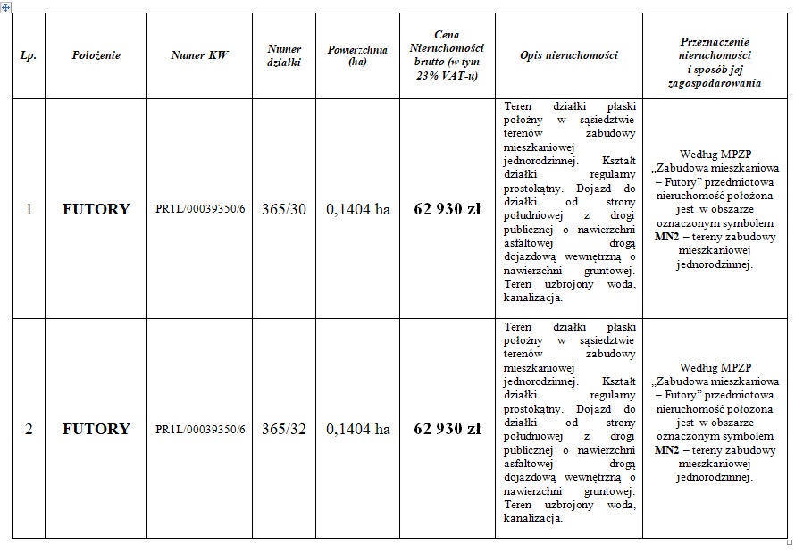 1. Wykaz nieruchomości przeznaczonej do sprzedaży w trybie przetargowym