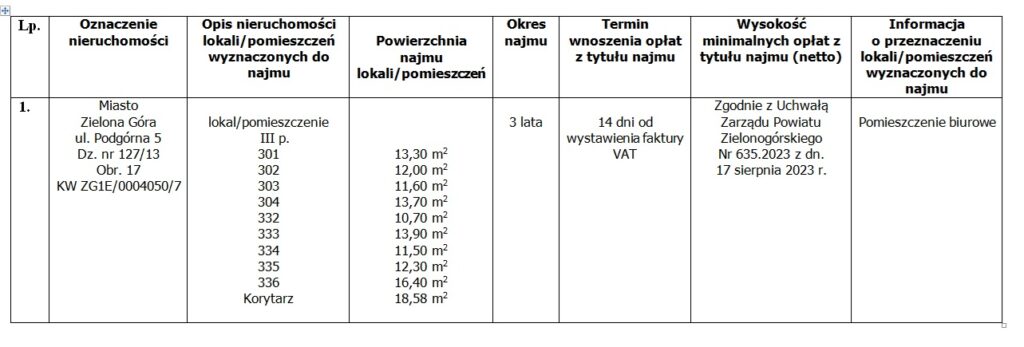 (Dz. U. z 2024 r. poz. 107), art. 25b w zw. z art. 25 ust. 2 oraz w związku z art. 25 ustawy z dnia 21 sierpnia 1997 r. o gospodarce nieruchomości (Dz. U. 2024 poz. 1145) podaje się do publicznej wiadomości wykaz lokali użytkowych przeznaczonych do najmu na rzecz dotychczasowych najemców oraz na podstawie Uchwały Zarządu Powiatu Zielonogórskiego NR 231.2025 z dnia 26 listopada 2025 r. w sprawie wyrażenia zgody na najem lokalu użytkowego podaje się do publicznej wiadomości wykaz lokali przeznaczonych do najmu na rzecz dotychczasowych najemców na okres do 3 lat.