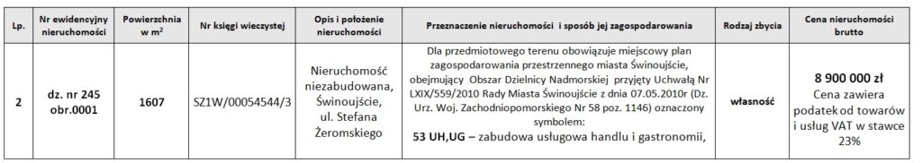 Na podstawie art. 30 ust. 2 pkt. 3 ustawy z dnia 8 marca 1990r o samorządzie gminnym (Dz. U. z 2025 r., poz. 1 ze zm.) i art. 35 ustawy z dnia 21 sierpnia 1997 r. o gospodarce nieruchomościami (DZ. U. z 2024 r., poz. 1145) przeznacza się do zbycia następującą nieruchomość z zasobu nieruchomości Gminy – Miasta Świnoujście: