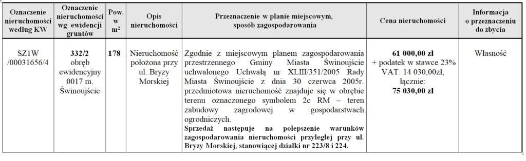 Na podstawie art. 30 ust. 2 pkt. 3 ustawy z dnia 8 marca  1990 r. o samorządzie gminnym (Dz. U. z 2025 r. poz. 1153 ze zm.) i art. 35 ustawy z dnia 21 sierpnia 1997r. o gospodarce nieruchomościami (Dz. U. z 2024 r. poz. 1145),  przeznacza  się do zbycia następującą nieruchomość z zasobu nieruchomości Gminy – Miasta Świnoujście.