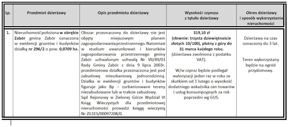 -Wykaz nieruchomości przeznaczonej do dzierżawy, zgodnie z art. 35 ust. 1 ustawy z dnia 21 sierpnia 1997 r. o gospodarce nieruchomościami (jednolity tekst Dz. U. z 2024 r. poz. 1145 ze zm.) zamieszcza się także na stronie internetowej www.powiat-zielonogorski.pl oraz w Biuletynie Informacji Publicznej. Wykaz podlega zamieszczeniu na stronie podmiotowej Wojewody Lubuskiego w Biuletynie Informacji Publicznej.