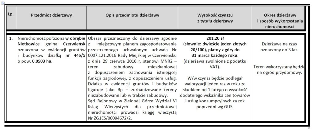 -Wykaz nieruchomości przeznaczonej do dzierżawy, zgodnie z art. 35 ust. 1 ustawy z dnia 21 sierpnia 1997 r. o gospodarce nieruchomościami (jednolity tekst Dz. U. z 2024 r. poz. 1145 ze zm.) zamieszcza się także na stronie internetowej www.powiat-zielonogorski.pl oraz w Biuletynie Informacji Publicznej. Wykaz podlega zamieszczeniu na stronie podmiotowej Wojewody Lubuskiego w Biuletynie Informacji Publicznej.