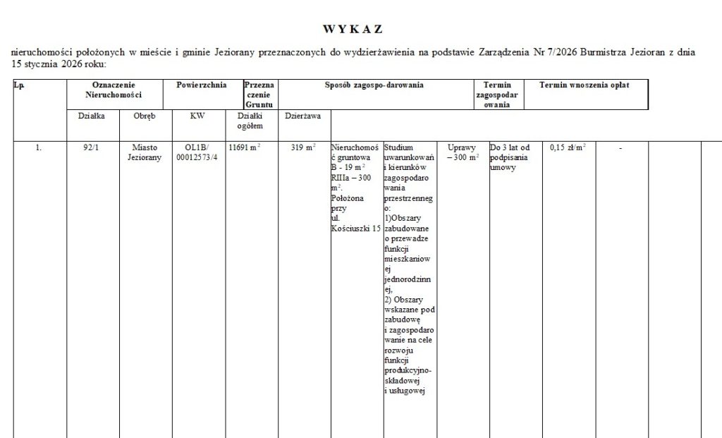 nieruchomości położonych w mieście i gminie Jeziorany przeznaczonych do wydzierżawienia na podstawie Zarządzenia Nr 7/2026 Burmistrza Jezioran z dnia 15 stycznia 2026 roku: