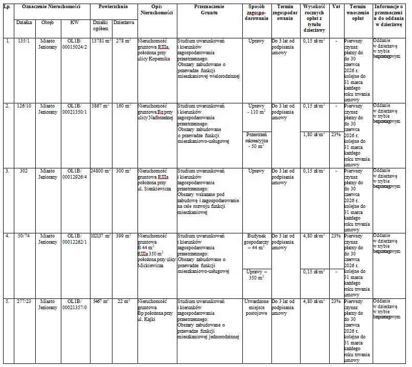 nieruchomości położonych w mieście Jeziorany przeznaczonych do wydzierżawienia na podstawie Zarządzenia Nr 28/2026 Burmistrza Jezioran z dnia 12 marca 2026 roku: