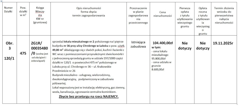 - Wykaz nieruchomości przeznaczonej do zbycia zostaje wywieszony na tablicy ogłoszeń w siedzibie Urzędu Miejskiego w Lubsku i na miejskiej stronie internetowej www.bip.lubsko.pl oraz na stronie www.infopublikator.pl w terminie od dnia 08 do 29 października 2025r.