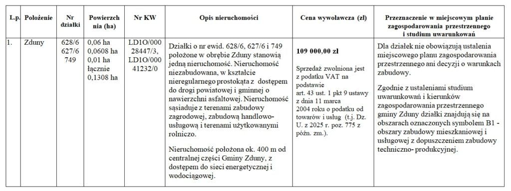 3. Niniejszy wykaz podlega ogłoszeniu na tablicy ogłoszeń Urzędu Gminy Zduny – obecnie Zduny 123, 99-44 Zduny, na stronie internetowej Urzędu Gminy Zduny www.bip.ugzduny.nv.pl, na tablicy ogłoszeń u sołtysa wsi – na okres 21 dni, ponadto informacja o wywieszeniu wykazu podlega ogłoszeniu w prasie internetowej infopublikator.pl.