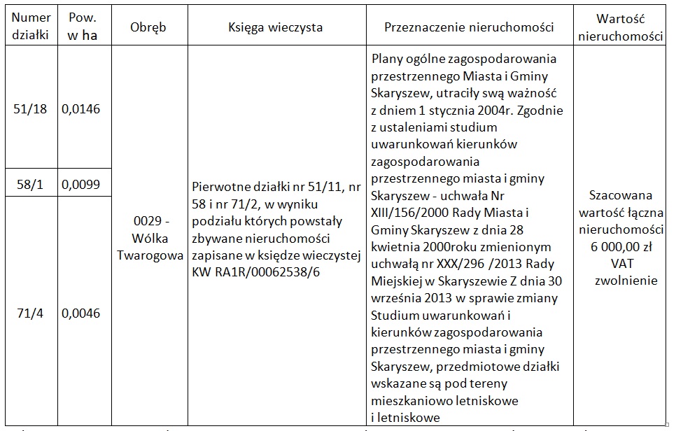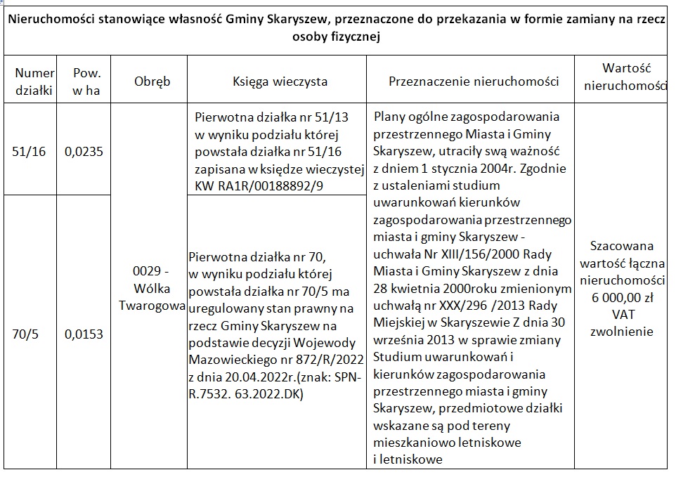 na podstawie art. 30 ust.1 i 2 pt. 3 ustawy z dnia 8 marca 1990r. o samorządzie gminnym (Dz. U. z 2025r. poz. 1153) w związku z art. 13 ust. 1 ustawy z dnia 21 sierpnia 1997r. o gospodarce nieruchomościami (Dz.U. z 2026r. poz. 399) oraz § 4 pkt. a i b, § 10 i § 11 pkt. 1 Uchwały Nr VII/58/2011 Rady Miejskiej w Skaryszewie z dnia 12 maja 2011r. w sprawie określenia zasad nabycia, zbycia i obciążenia oraz wydzierżawienia na okres dłuższy niż 3 lata nieruchomości stanowiących własność Miasta i Gminy Skaryszew (Dz. Urz. Woj. Maz. Nr 109, poz. 3477 z 2011r.), Burmistrz Miasta i Gminy Skaryszew podaje do publicznej wiadomości wykaz nieruchomości przeznaczonych do zbycia w drodze zamiany: