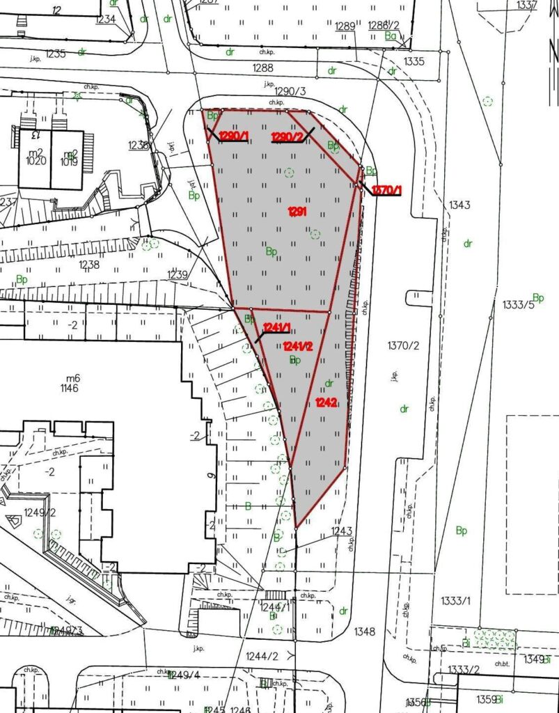 2.Oznaczenia geodezyjneObręb: 0013 Działki Leśne , Działki nr: 1290/1 pow. 10m², nr 1290/2 pow.41 m², 1291 pow. 672 m²,  objęte KW GD1Y/00049062/5, działki nr 1241/1 pow. 23 m², 1241/2 pow. 175 m² objęte Kw nr GD1Y/00009529/5 oraz działki nr 1242 pow. 285 m², 1370/1  pow. 3m² objęte Kw nr GD1Y/00008662/2.   Łączna powierzchnia nieruchomości wynosi 1.209m²