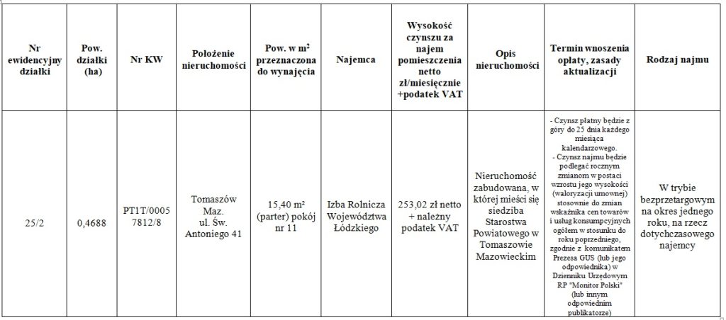 informuje, że w dniu 24 kwietnia 2026 roku na tablicy ogłoszeń Wydziału Geodezji i Gospodarki Nieruchomościami Starostwa Powiatowego w Tomaszowie Mazowieckim, przy ulicy Św. Antoniego 41 (I piętro) został wywieszony na okres 21 dni, wykaz dotyczący pomieszczenia biurowego przeznaczonego do oddania w najem w trybie bezprzetargowym mieszczącego się w budynku przy ul. Św. Antoniego 41 w Tomaszowie Mazowieckim, na rzecz Izby Rolniczej Województwa Łódzkiego.