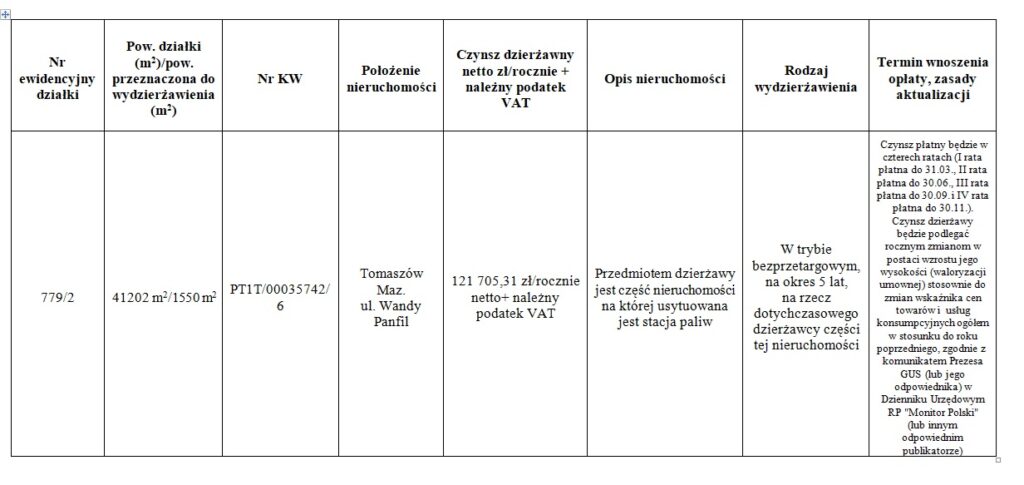 informuje, że w dniu 15 grudnia 2025 r. na tablicy ogłoszeń Wydziału Geodezji i Gospodarki Nieruchomościami Starostwa Powiatowego w Tomaszowie Mazowieckim, przy ulicy Św. Antoniego 41 został wywieszony na okres 21 dni, wykaz dotyczący części nieruchomości (1550,00 m²) przeznaczonej do oddania w dzierżawę w trybie bezprzetargowym, położonej   w obrębie 23 Tomaszowa Mazowieckiego, oznaczonej numerem działki 779/2 (ul. Wandy Panfil).