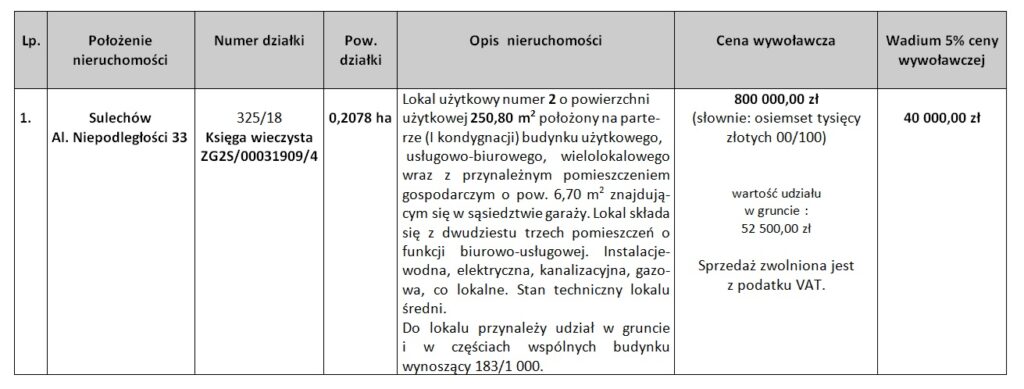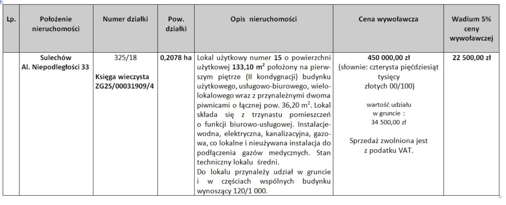 II przetargi ustne nieograniczone na sprzedaż prawa własności lokali użytkowych stanowiących własność Powiatu Zielonogórskiego wraz z udziałem w gruncie i częściach wspólnych budynku, położonego w Sulechowie przy ul. Al. Niepodległości 33, przeznaczonych do sprzedaży, zgodnie z art. 35 ust. 1 i 2 ustawy z dnia 21 sierpnia 1997 r. o gospodarce nieruchomościami (jednolity tekst Dz. U. z 2024 r., poz. 1145 ze zm.).