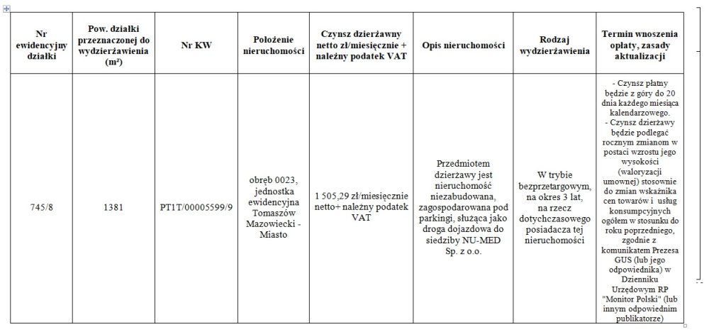 informuje, że w dniu 29 grudnia 2025 roku, na tablicy ogłoszeń Wydziału Geodezji i Gospodarki Nieruchomościami Starostwa Powiatowego w Tomaszowie Mazowieckim, przy ulicy Św. Antoniego 41 (I piętro) został wywieszony na okres 21 dni, wykaz dotyczący oddania w dzierżawę, w trybie bezprzetargowym, nieruchomości położonej w obrębie 23 Tomaszowa Mazowieckiego, oznaczonej numerem działki 745/8, na rzecz Specjalistycznego Szpitala Onkologicznego NU-MED Sp. z o.o.